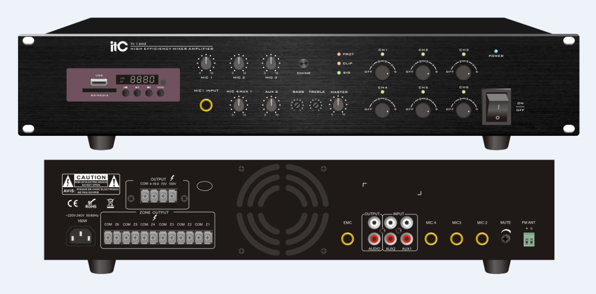 Mixer amplificator cu 6 zone de reglaj ITC TI-240Z, pentru sisteme de Public Address (PA), putere 240W@100V, MP3(USB/SD)+FM Tuner+Bluetooth, 4 x intrari de microfon, 2 x intrari auxiliare, 1 x intrare EMC, intrare backup 24VDC, dimensiuni 484×353×88mm, greutate 8.0Kg
