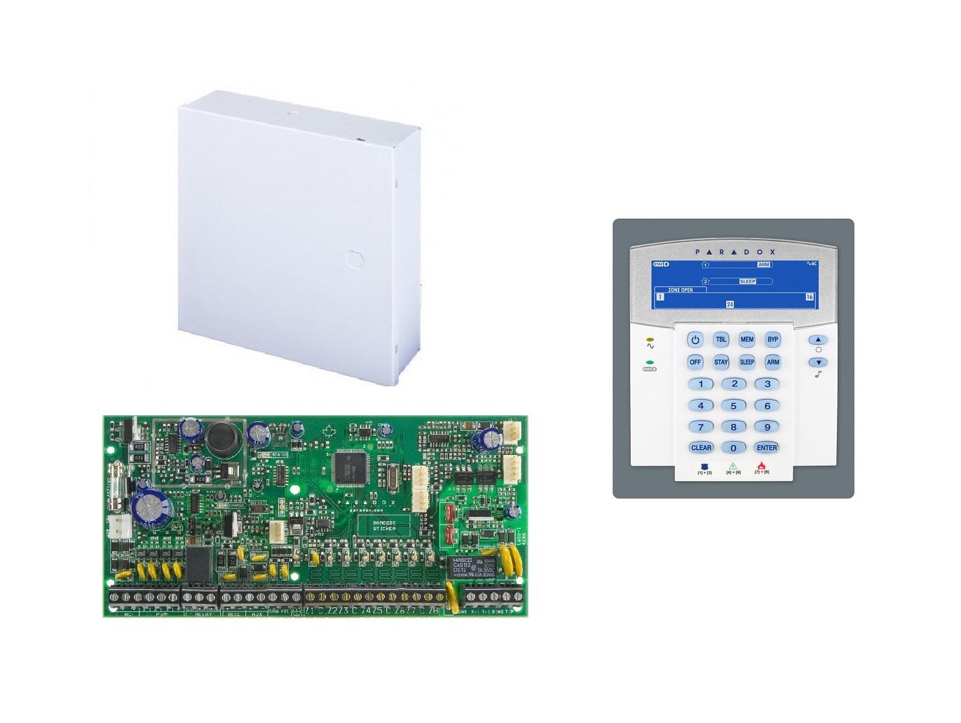 Centrala Paradox SP6000;  8 intrări de zonă sau 16 cu ATZ,  extensibila la 32 zone;  extensibilă la 16 ieşiri PGM –> (2 pe placă);  trigger PGM +/;  intrare pentru detectori de fum,  pe 2 fire;  sursă alimentare în comutaţie:  1.5A; consum iesire Aux:  Nominal 600mA –  Maxim 700mA  (protectie electronica).  Include tastatura K35-1buc si cutie cu traf -1buc.