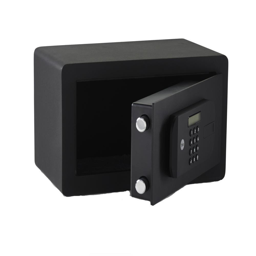 Seif compact de inalta siguranta Yale, 200x350x200 mm YSEB/200/EB1; Caracteristici: Ușa tăiată cu laser-întărită cu placă armată anti- forare; Mecanism deschidere ușă automat; Încuietoare motorizată cu  nivel de securitate ridicat; Blocare timp de 1min în cazul introducerii unui cod greșit de 3 ori; Display LCD clar cu tastatură; Luminat la interior pentru a fi văzut ușor conținutul; Cârlige la interior pentru a agăța chei sau alte obiecte mici; Terminal extern 9v (dacă se termină bateriile interne, poate fi folosit pentru a deschide seiful); Baterii incluse; Volum: 9.6L;